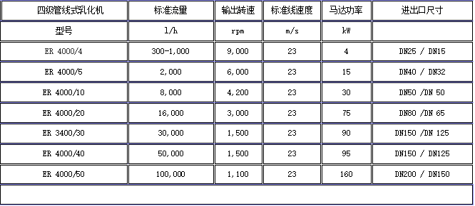 ER4000系列管线四级管线式乳化机具有非常高的剪切速度和剪切力,粒径约为0.1-2微米可以确保高速分散乳化的稳定性。该设备可以适用于各种分散乳化工艺,也可用于生产包括对乳状液,悬浮液和胶体的均质混合。高剪切分散乳化机由定/转子系统生的剪切力使得溶质转移速度增加,从而使单一分子和宏观分子媒介的分解加速。